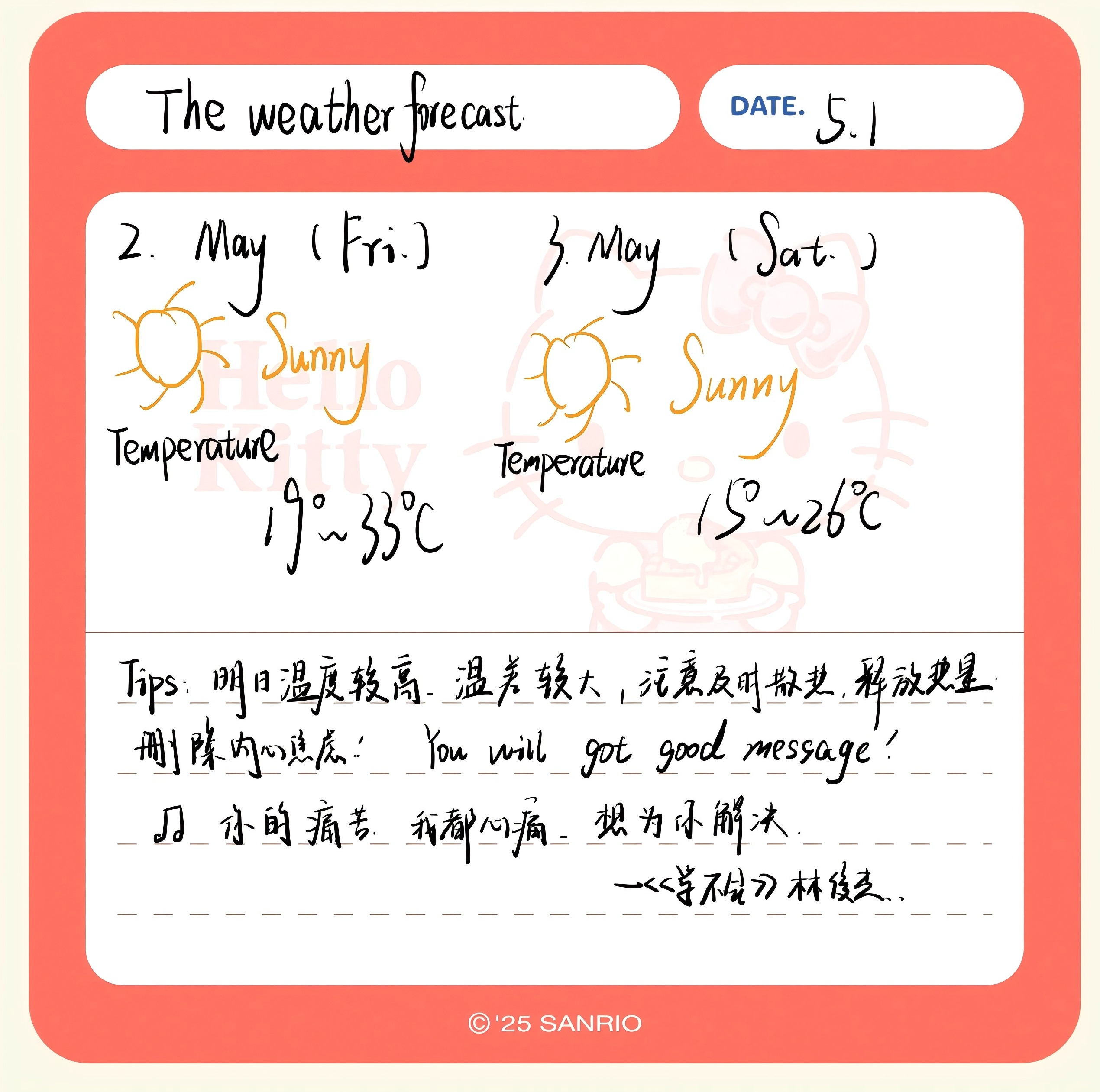 Tips:明日温度较高,温差较大,可为自己降降温,释放压力!