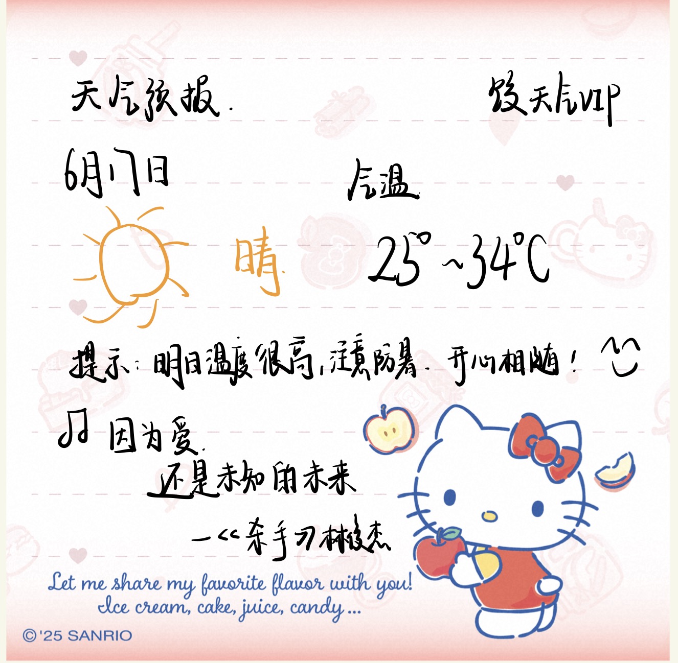 提示:明日气温更高 注意防暑 出行注意防晒 好运常在 开心相随!